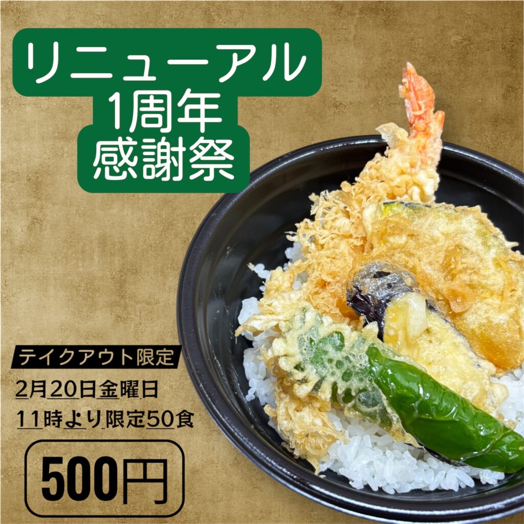 2 102026 【2月20日限定】リニューアル1周年 感謝の天丼500円! info 笑フ天(えふてん)は、おかげさまでリニューアルから1周年を迎えます。日頃のご愛顧に感謝を込めて、テイクアウト限定の特別企画を開催! 海老天&野菜天の特製天丼をワンコイン500円でご提供致します! 📅 日時:2月20日(金)🕚 時間:11時〜⚠️ 限定50食・売り切れ次第終了! ご近所の方も、お仕事帰りの方も、ぜひお立ち寄りください!